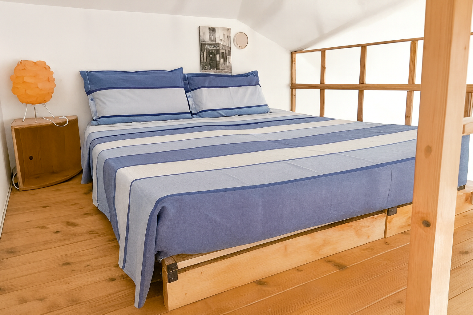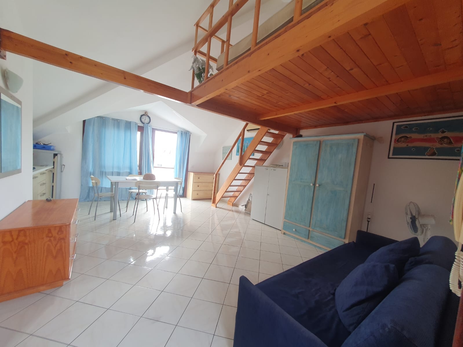 The sleeping area is located in a distinctive mezzanine, making the most of the interior space while offering privacy and a modern layout. The bathroom is equipped with all comforts, featuring well-finished details and excellent functionality, although it does not have a window.